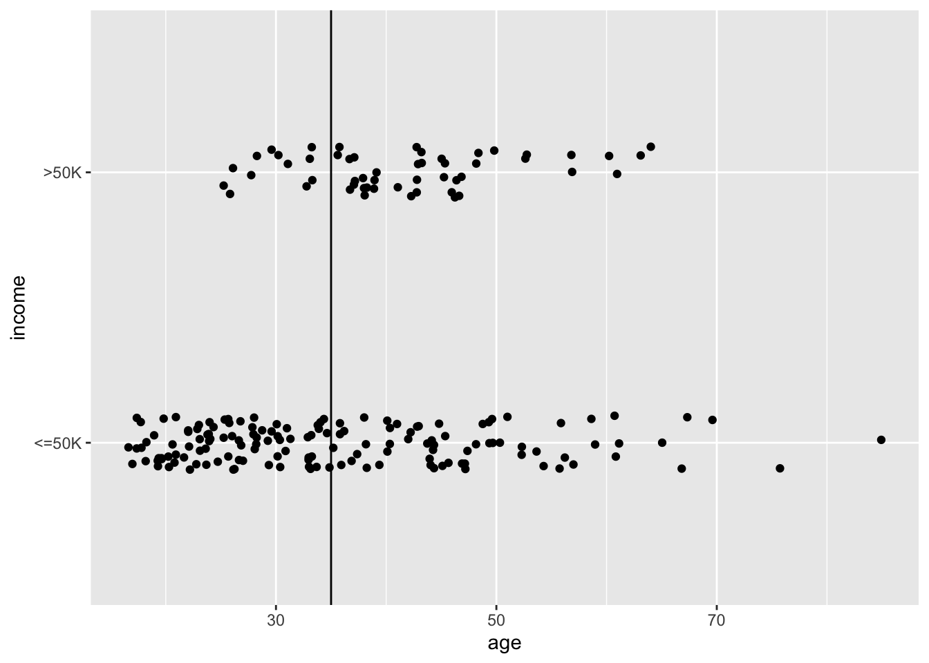 # comment out -- don't overwrite your bootstrap sample!census_boot <- census %>%sample_n(size =200, replace = T)# for continuous variablescensus_boot %>%ggplot(aes(x = age, # replace with predictor name y = income)) +geom_jitter(height =0.1) +geom_vline(xintercept =35) # adjust cutoff