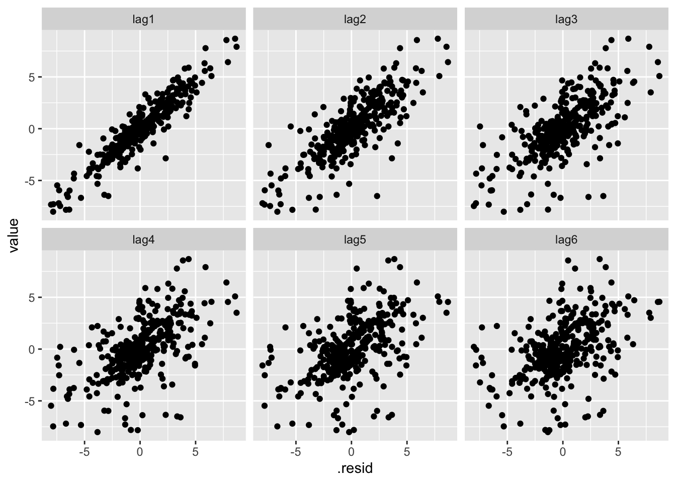 If we plot the residuals against themselves at several time lags, we can observe the correlation decaying gradually.